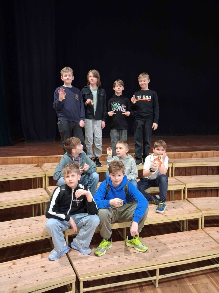 Mazliet jaudīgāks starts mūsējiem izdevās 5.-8.klašu grupā, kur Kasparam Nēliusam (5.d) pirmā vieta starp piekto klašu skolēniem, bet Jānis Bukins (6.b) izrādījās spēcīgākais sestklasnieku konkurencē. Pēdējo maču liktenis bija lēmis viņiem aizvadīt savā starpā, un vēl joprojām kaislības nerimst, vai Jāņa uzvarai nebija jābūt draudzīgam neizķirtam. Kas to var zināt, kā strīds izšķirams…? Bet labāk drāma, nekā garlaicība, un galu galā – abiem biļetes uz Cēsīm jau kabatā un godam nopelnītās medaļas kaklā. Šajā grupā ar rezultātu 7/7 uz augstākā pakāpiena kāpa bijušais laurēns Kārlis Vanags (SVĢ, 7.klase), apsteidzot Rūdolfu Apfelbaumu (SVĢ, 8.klase) un Ati Āboliņu (1.psk, 6.klase).