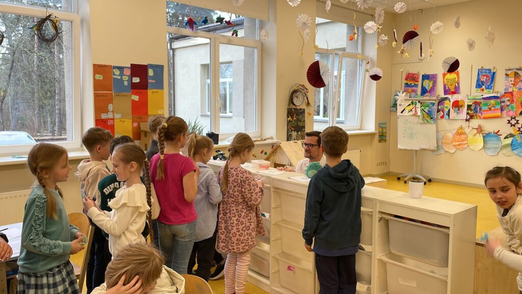 Rūdolfs Birnbaums viesojās divās klasēs – 1.a un 3.a. Ja 1.a klase mācījās par procentiem dzīvē un matemātikā, izspēlējot praktisku preču pirkšanu un cenšoties saprast, kā veidojas atlaides, tad 3.a klase runāja par valodu – kāpēc tā nepieciešama un cik daudz valodu vispār ir, kāpēc ieguvējs būs tas, kurš daudz lasa un šādi bagātina savu valodu. Tāpat 3.a klasē viesojās arī divas mammas – Dace Mežavilka un Diāna Vaitniece. Vecāki bija rūpīgi gatavojušies, plānojuši mācību stundas tā, lai skolēni domātu par savām interesēm, nākotnes izvēlēm un mācīšanos šobrīd, lai to sasniegtu.
