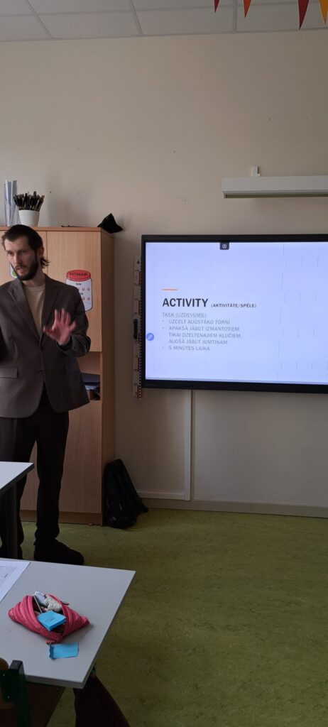 1.d klasē ciemojās divi vecāki – Ingus Rozenfelds un Kaspars Enģelis. Ingus skolēniem pastāstīja par savu ikdienu, palīdzot cilvēkiem atrast savas sapņu mājas, bet tētis Kaspars iepazīstināja skolēnus ar būvniecības nozari un to, kā šajā jomā noder angļu valoda.
