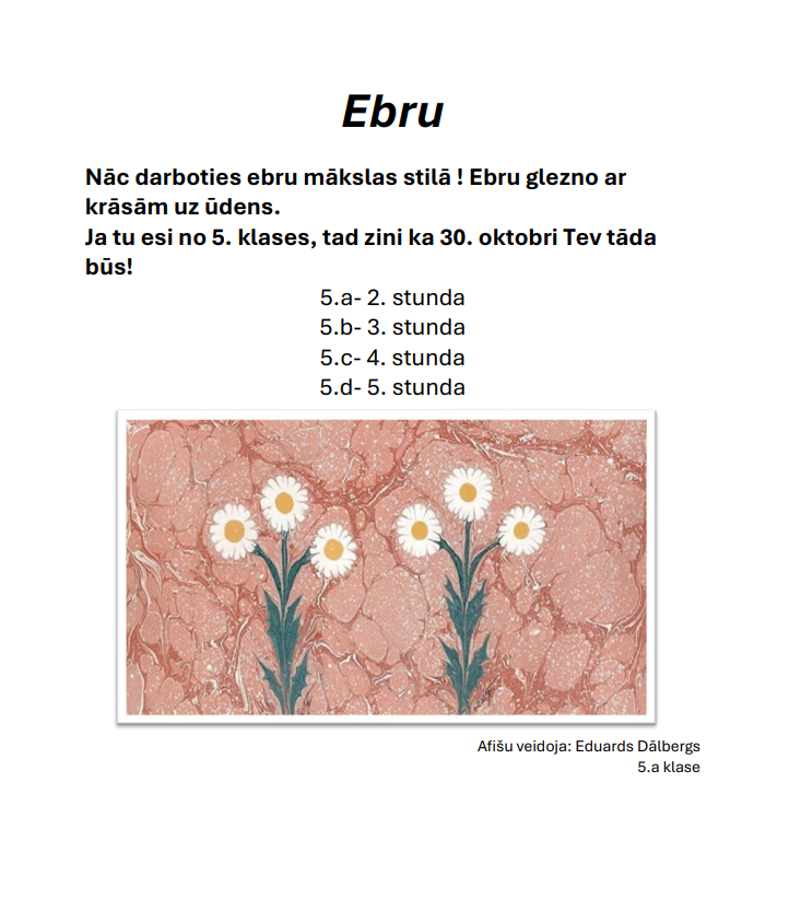 Oktobra pēdējā darba dienā, kultūras nedēļas noslēgumā un “Latvijas Skolas somas” programmas ietvaros, pie 6.klašu laurēniem viesojās mākslinieces ar nodarbību par miniatūru mākslu. Skolēni uzzināja par miniatūru mākslu pasaulē, apskatīja mazu miniatūru izstādi, paši izgatavoja miniatūru skapīti.